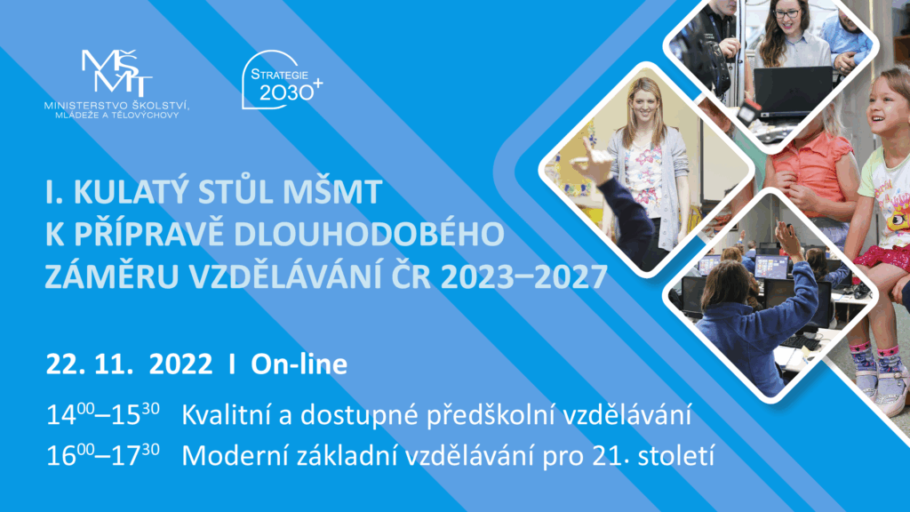 Ministerstvo školství, mládeže a tělovýchovy (MŠMT) Vás zve na první kulatý stůl k přípravě Dlouhodobého záměru vzdělávání ČR na období 2023-2027. Jde o on-line setkání, které se uskuteční v úterý 22. 11. 2022 odpoledne mezi 14:00-17:30, kde budou představeny a spolu s odborníky diskutovány návrhy opatření pro první dvě témata: předškolní vzdělávání a základní vzdělávání, a to včetně návaznosti na postup a plnění cílů Strategie 2030+.